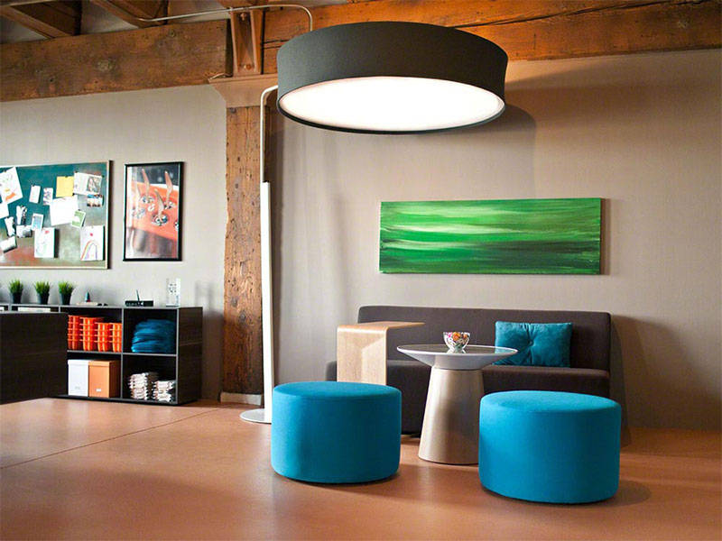 Добавить индивидуальность месту можно при помощи контрастных цветовых решений стен, а также элементов мебели и офисных аксессуаров. Яркие пуфики подчеркнут корпоративный стиль компании и дополнят имеющуюся мебель.