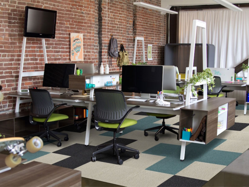 Если позволяет бюджет, вы можете изменить материал напольного покрытия в зоне приема гостей, оставив рабочие зоны без изменений. Эта зона занимает особое положение в офисе, она лицо компании, и ее реновация отражает жизнь компании. Мы часто используем ковровую плитку Flor из-за легкости в монтаже и гибкости в создании индивидуальных рисунков и узоров. Также она легко демонтируется на случай если офисное помещение арендуется.