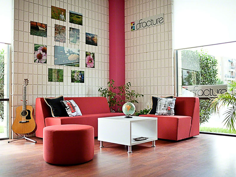 Fracture - это компания, которая печатает цифровые изображения на стекле, теперь она размещает фотозаказы клиентов и на своих стенах. Составленные вместе фотографии образуют гармоничный артобъект, детали которого вдохновляют на творчество, а изображения, захватывающие логотип компании определяют принадлежность к бренду. Оригинально будут смотреться артобъекты, созданные из нарисованных на стенах логотипов компаний или пожеланий заказчиков, выполненных интересными шрифтами.